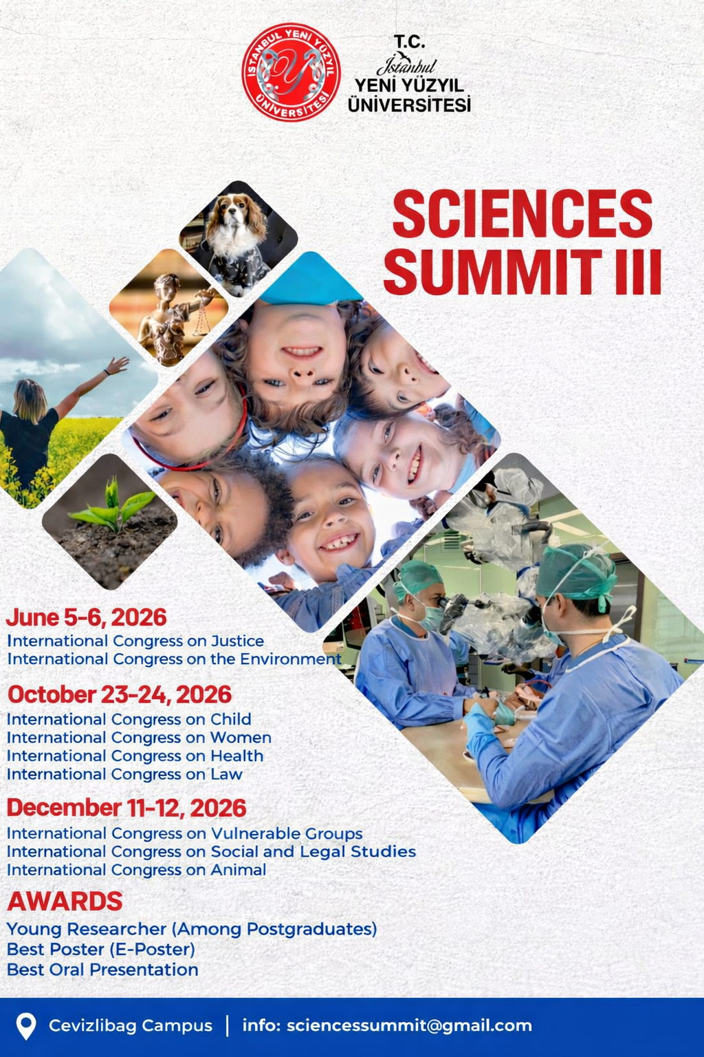 Tüm insanlığın ulaşmak istediği bir erdem olan ADALET üzerine yapılacak III. Uluslararası Adalet Kongresi İstanbul Yeni Yüzyıl Üniversitesi tarafından gerçekleştirilecektir. Dünya genelinde her alanda akademisyenler başta olmak üzere kongremiz aşağıdaki başlıklar altında çalışmalarını gerçekleştirecektir. Kongre katılımı ücretsizdir. Bu süreçte üniversitemiz gala gecesi düzenleyecek, katılımcılara öğle yemekleri ve ara ikramlar sunacaktır.Ayrıca, kongre’de